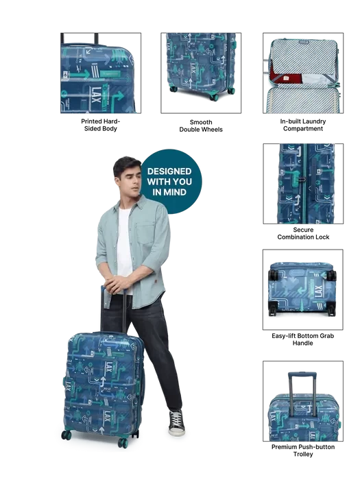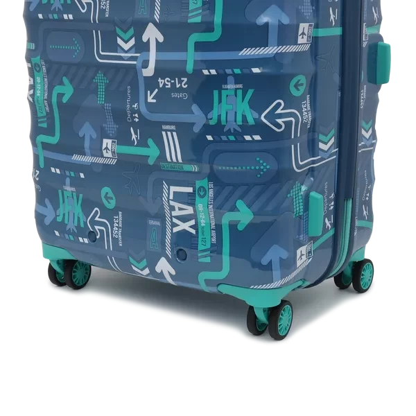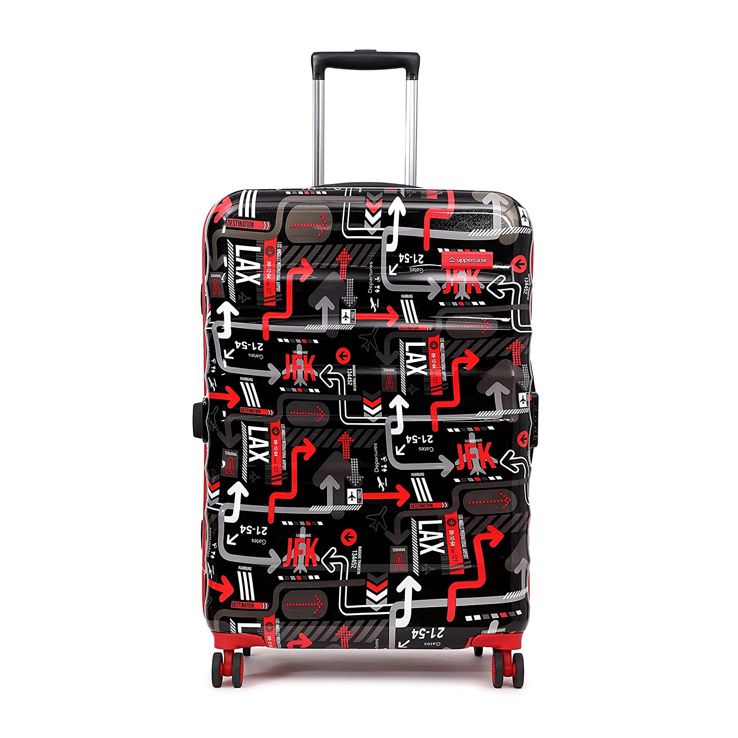 uppercase JFK hard luggage trolley is the perfect solution for your travel needs. With its stylish printed design and 8 wheel design, it provides effortless mobility and stability while you're on the move. The push-button trolley system allows you to adjust the height of the handle to your comfort. It also features an in-built laundry compartment, so you can keep your dirty clothes separate from your clean clothes. The shock-absorbing lugs provide added protection to your belongings, ensuring they arrive at your destination in the same condition as when you packed them. Whether you're embarking on a long trip or a short getaway, this trolley suitcase offers ample space for all your essentials. Its sturdy construction and reliable design make it the ideal choice for travelers who demand the best.
