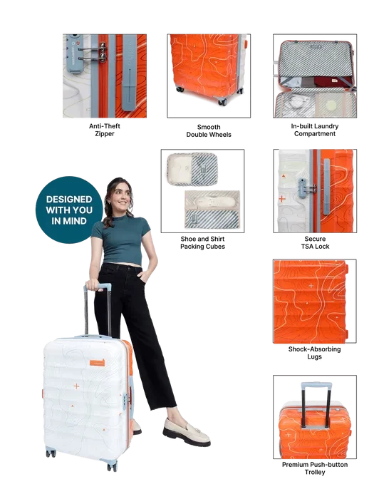 It also features an in-built laundry compartment, so you can keep your dirty clothes separate from your clean clothes along with a conveninet ConviPack on one side. Topo suitcase has a TSA approved lock security. Separate shoe and shirt packing cubes help you organise your bag in an efficient way.